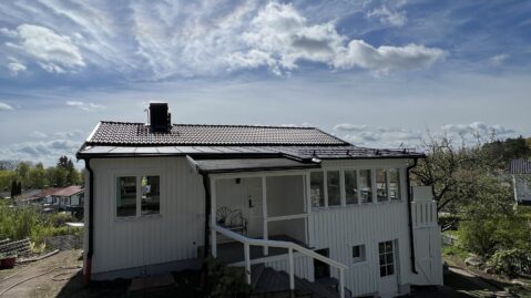 Ny underlagspapp RC Classic YEP 2200 kk, läkt, Benders Palema 2-kupigt ytbehandlad betongpannor har monterad. Nya hängrännor, stuprör, vinkelränna, fot och…