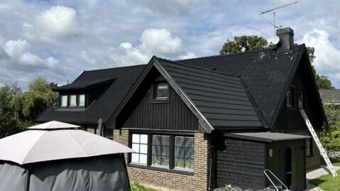 Ny papp Icopal Macoflex YAP 2200 kk, läkt, Benders Candor 2-kupigt betongpannor. Nya hängrännor, stuprör, vinkelrännor, avloppsrör stos, skorstenskrage, gångbrygga, snörasskydd och vindskivor…